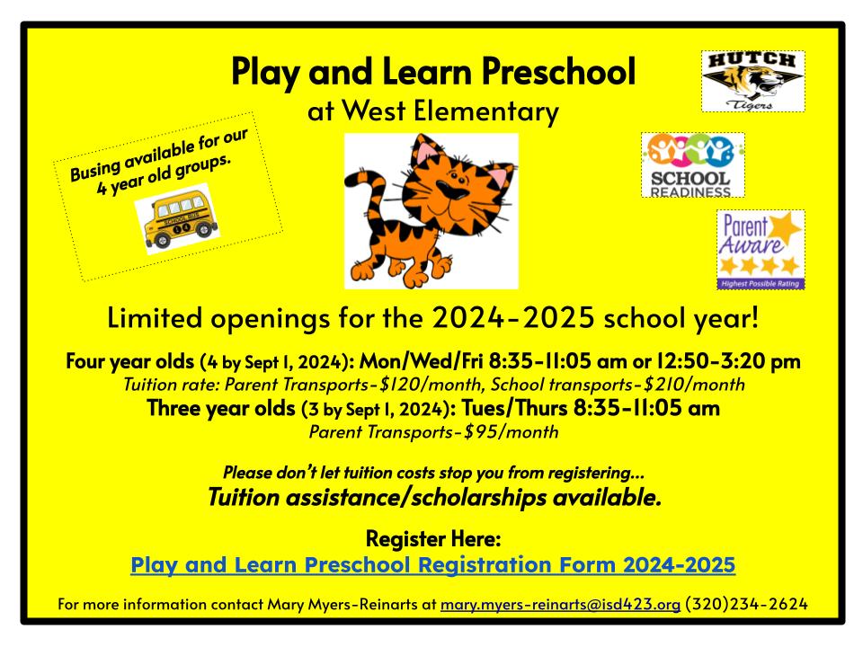 Four year olds – Monday, Wednesday, Friday from 8:35-11:05 am or 12:50-3:20 pm