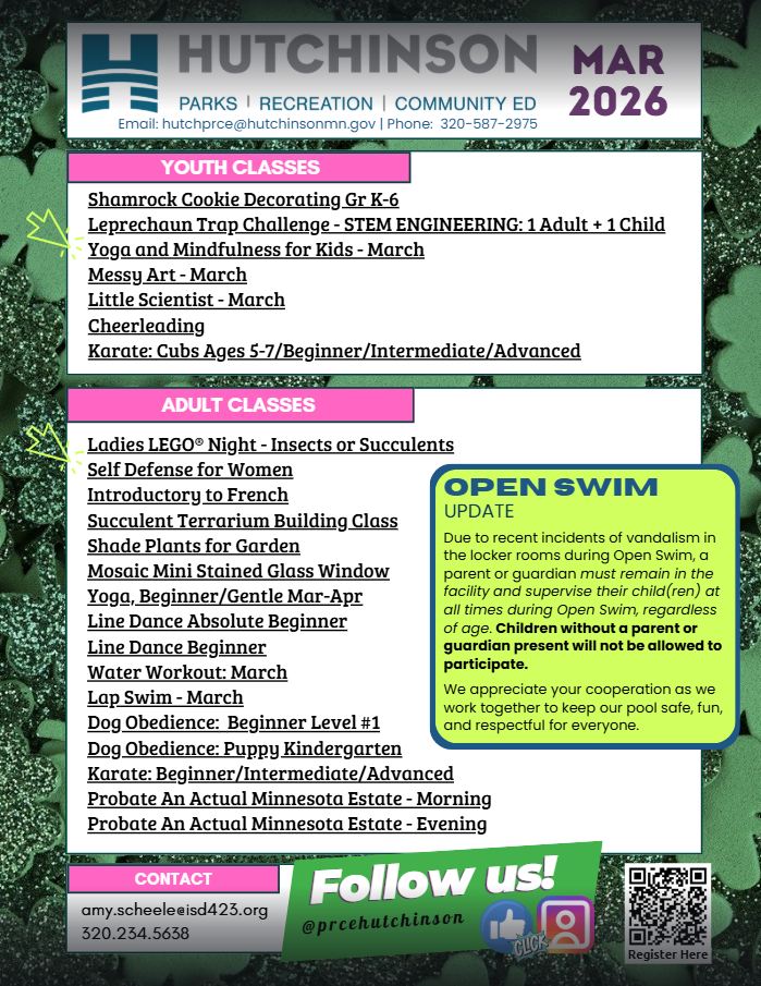 Community Education in Hutchinson provides lifelong learning experiences for people of all ages, abilities, and cultures through programs and services. Classes are creatively designed…flexible because they are built around the real needs of the people in our community!